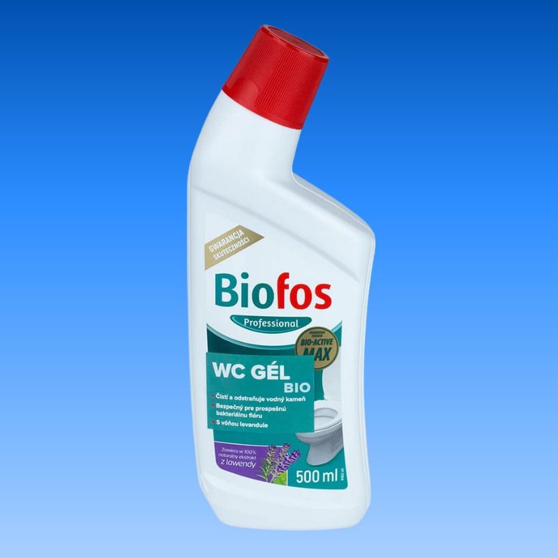 Biofos WC gel je biologický čistiaci prostriedok určený na dôkladné a šetrné čistenie toaliet, umývadiel, vane, brodzíkov, glazúry a armatury. Obsahuje 100 % prírodný extrakt z levandule, ktorý zanecháva príjemnú vôňu.