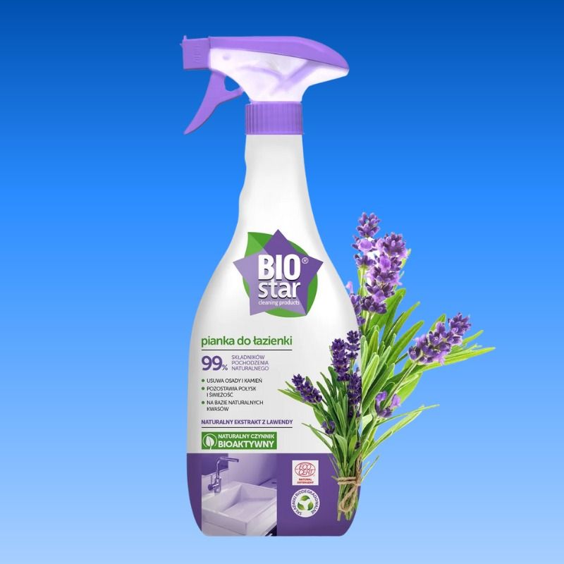 Ekologická čistiaca pena Biostar obsahuje 99 % zložiek prírodného pôvodu vrátane rastlinných sole, Bio-Active Agent s probiotikami a levanduľový extrakt. Vyvinutá pre bezpečné a účinné čistenie umývateľných povrchov v kúpeľni – keramika, sklo, chrómy, glazúra, nehrdzavejúca oceľ.