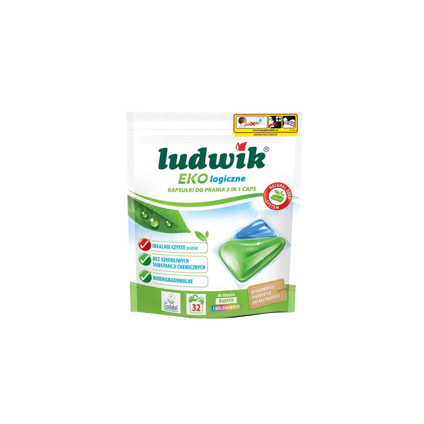 Ludwik Ekologické kapsule do prania 2 in 1 (32 ks) – účinné kapsule pre biele aj farebné prádlo, ktoré sú ekologické, biodegradovateľné a bez škodlivých chemikálií. Certifikované EU Ecolabel pre tento ekologický výber.