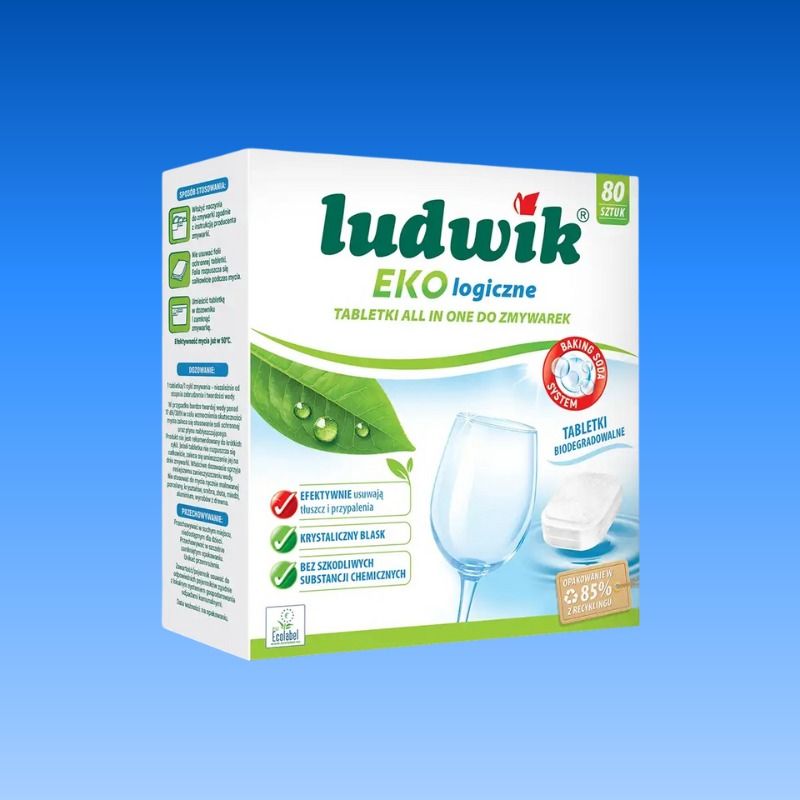 Ekologické tablety Ludwik All-in-One ponúkajú účinné umývanie bez kompromisov. Formula obsahuje aktívny kyslík, Baking Soda System a enzýmy na odstránenie mastnoty, zaschnutých zvyškov, kávy a čaju. Tabletky sú balené v rozpušťateľnej folii (žiadne mikroplasty!), bez fosforanov, borátov, konzervantov či parfumov. Vhodné pre citlivú pokožku a šetrné k životnému prostrediu. Disponujú certifikátom EU Ecolabel a Nordic Swan.