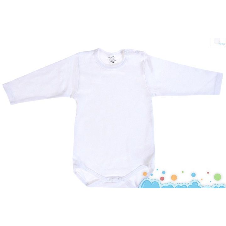 0144 biele kojenecké body s dlhým rukávom, vyrobené zo 100 % bavlny. Dostupné vo veľkostiach 62, 68, 74 a 80 — pohodlné a priedušné, ideálne ako základný kúsok do detského šatníka.