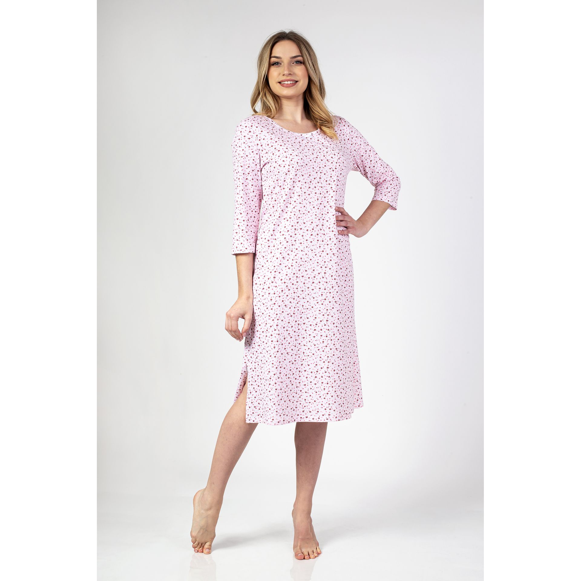 Regina 137 dámska nočná košeľa z 100 % bavlny s 3/4 rukávom a jemnou kvetinovou potlačou. Voľný strih pre pohodlie. Dostupná vo veľkostiach M až 3 XL a v odtieňoch ružová, nebeská a marhuľová.