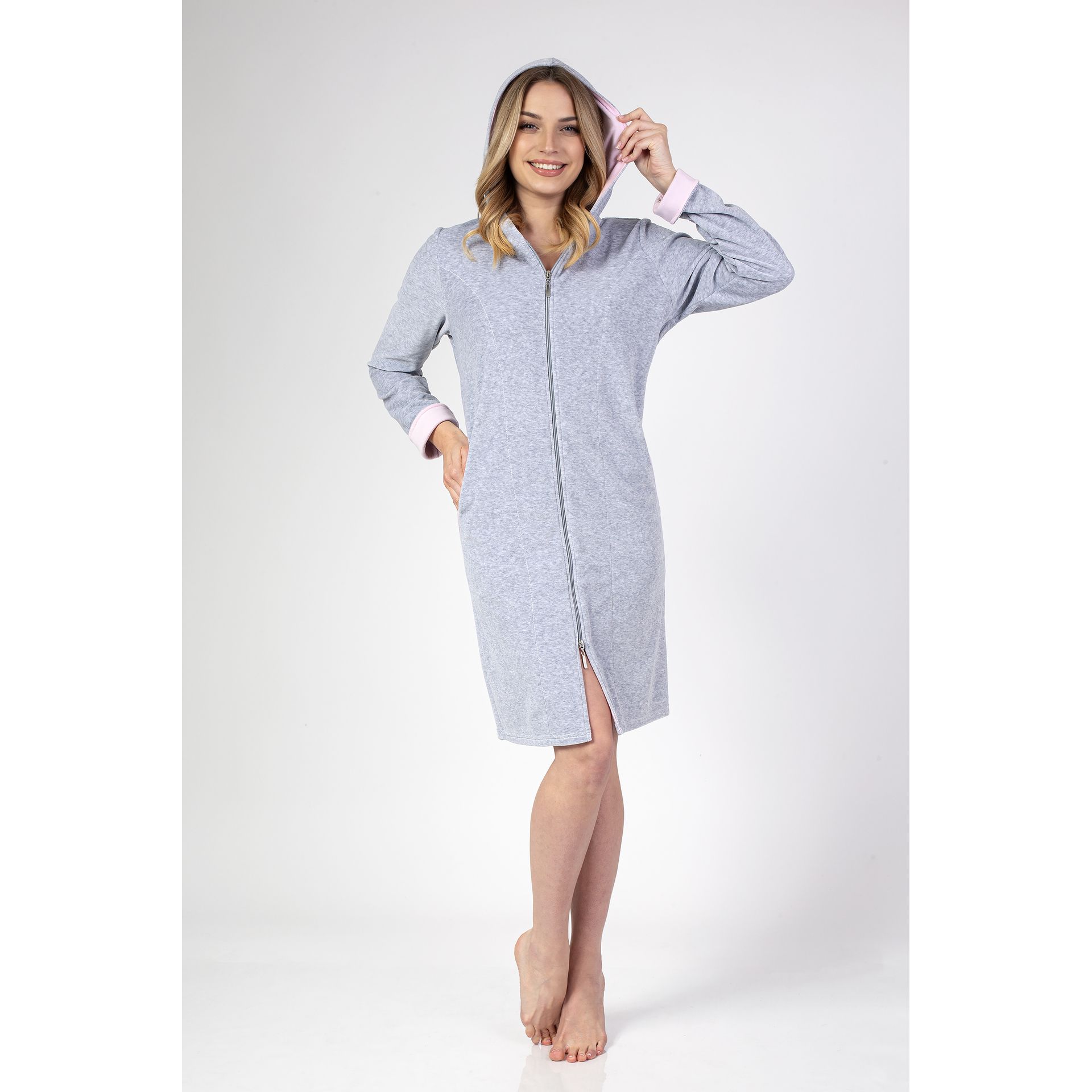 Regina 684 dámsky župan velúrový vyrobený z hebkého úpletu. Disponuje kapucňou, vreckami a zapínaním na zips. Dostupný v šedej a modrej farbe, veľkosti M až 3XL.
