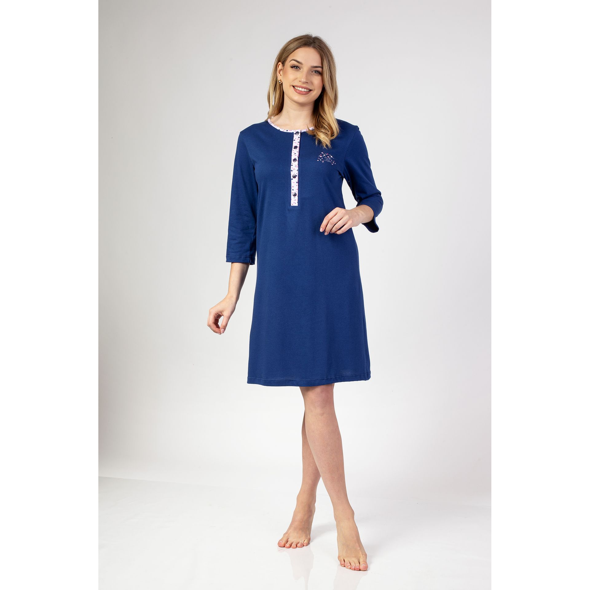 Táto nočná košeľa je vyrobená z kvalitnej 100 % bavlny, ktorá je priedušná a jemná na pokožku. Okrúhly výstrih a trojštvrťové rukávy ponúkajú pohodlný a súčasne štýlový strih vhodný na každodenné nosenie počas spánku aj oddychu doma.