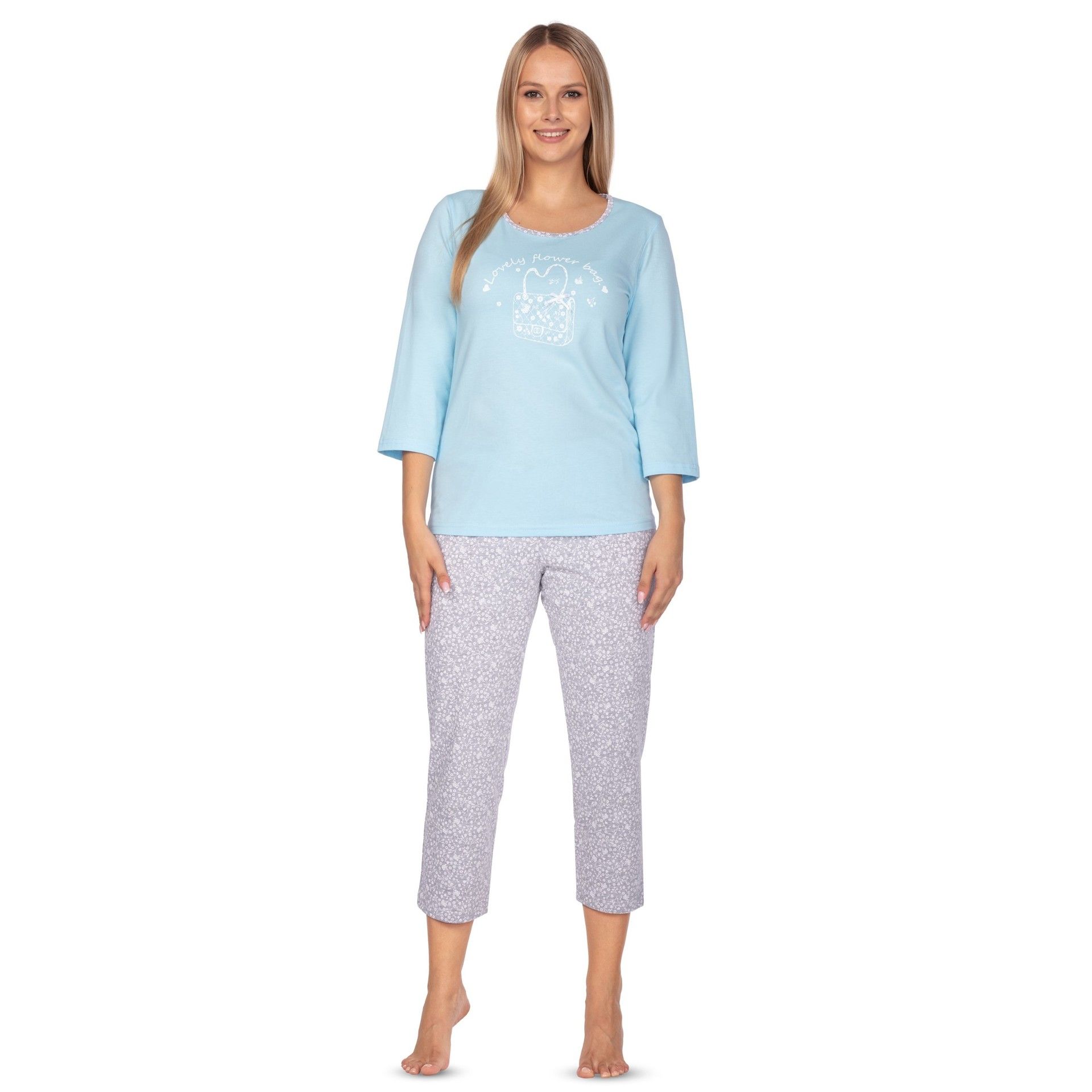 Regina 638 dámske pyžamo z jemnej 100 % bavlny. Tričko zdobí mašlička, nohavice sú vzorované. Veľkosti M–3 XL.