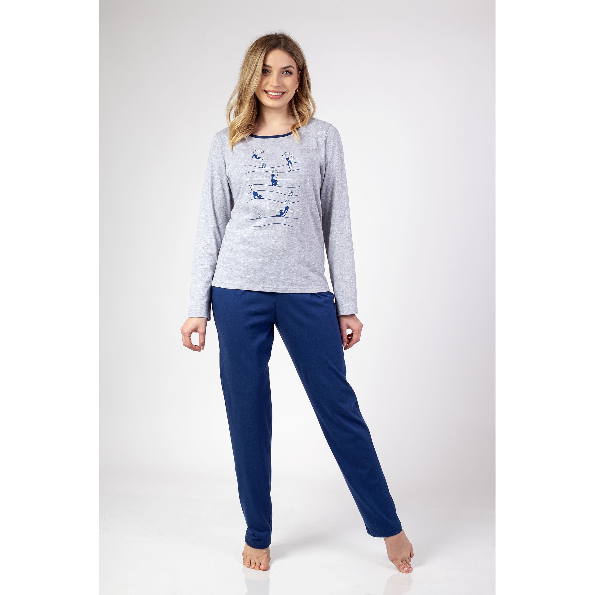 Regina 668 dámske pyžamo z 100 % bavlny – tričko s ozdobnou potlačou vpredu a hladké nohavice v kontrastnej farbe. Dostupné vo veľkostiach M–3XL v odtieňoch melanž a nebeská modrá.