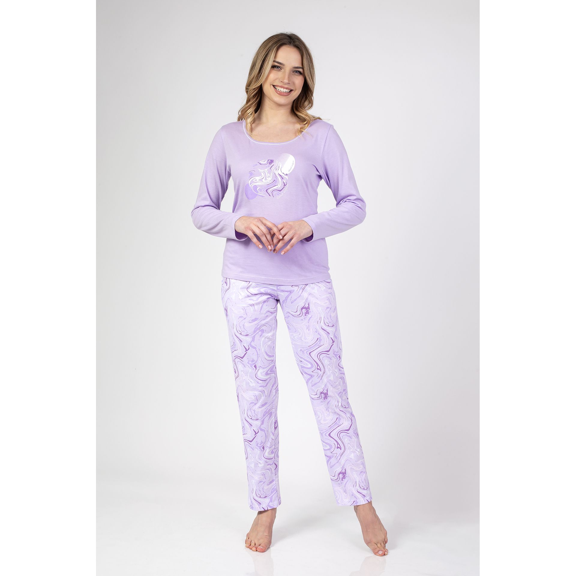 Regina 672 dámske pyžamo z jemnej 100 % bavlny. Tričko s dlhým rukávom a potlačou vpredu, rovné nohavice. K dispozícii vo farbách modrá, fialová a marhuľová. Veľkosti M až 4 XL.