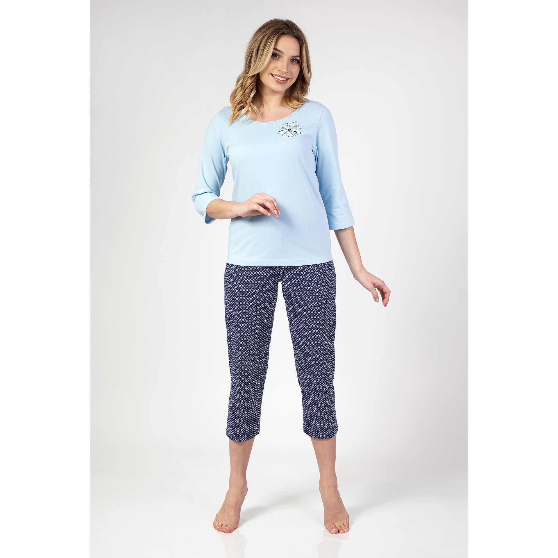 Toto elegantné dámske pyžamo je vyrobené zo 100 % bavlny, ktorá je jemná na pokožke a poskytuje komfort počas spánku aj domácich chvíľ. Hladký top je zdobený jemnou potlačou, spodná časť sú štýlové vzorované 3/4 nohavice.