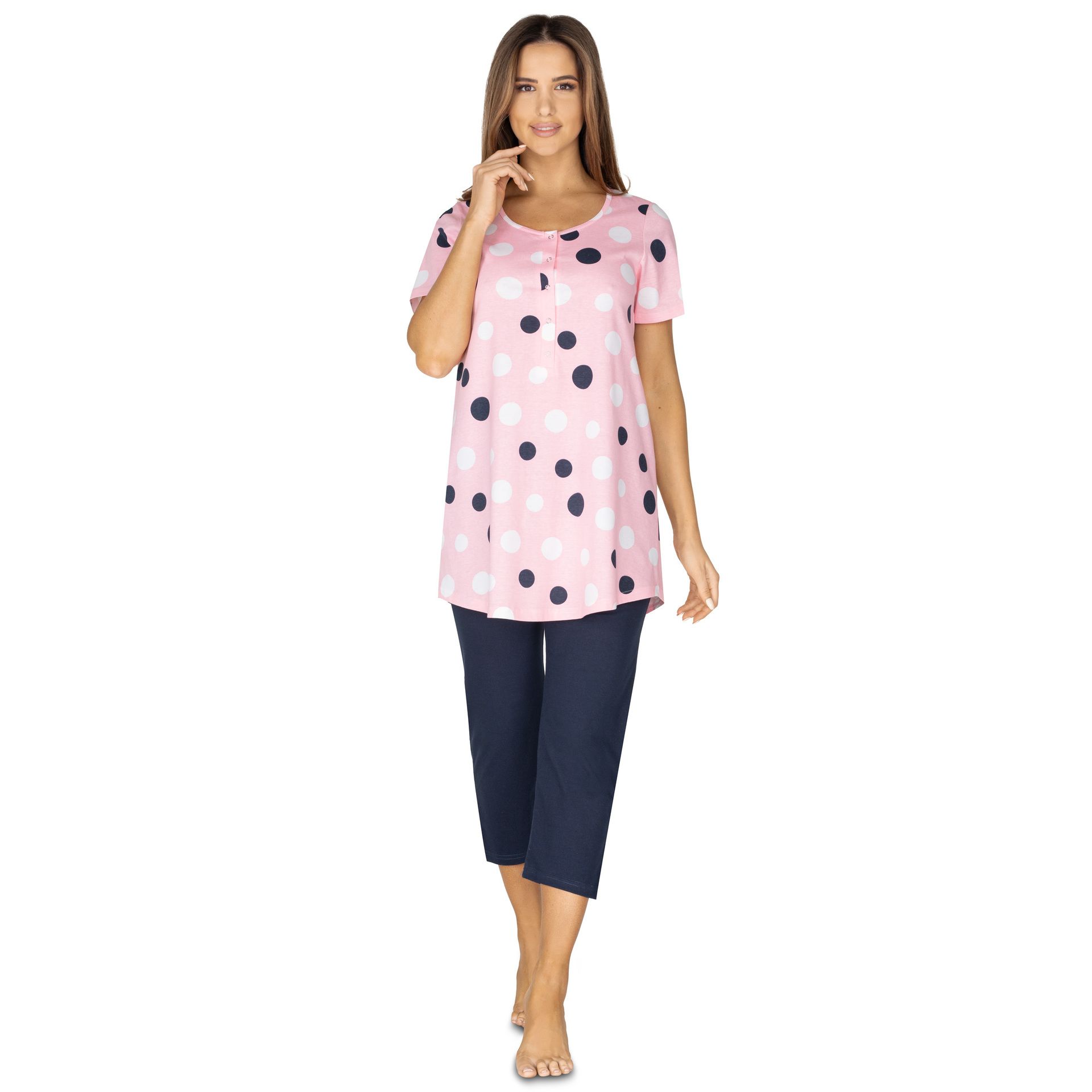 Dvojdielne dámske pyžamo z príjemnej 100 % bavlny. Dlhšie tričko je vhodné aj pre dojčiace mamičky, spodná časť sú pohodlné 3/4 nohavice. Dostupné vo veľkostiach M vo farbe ružovej a modrej.