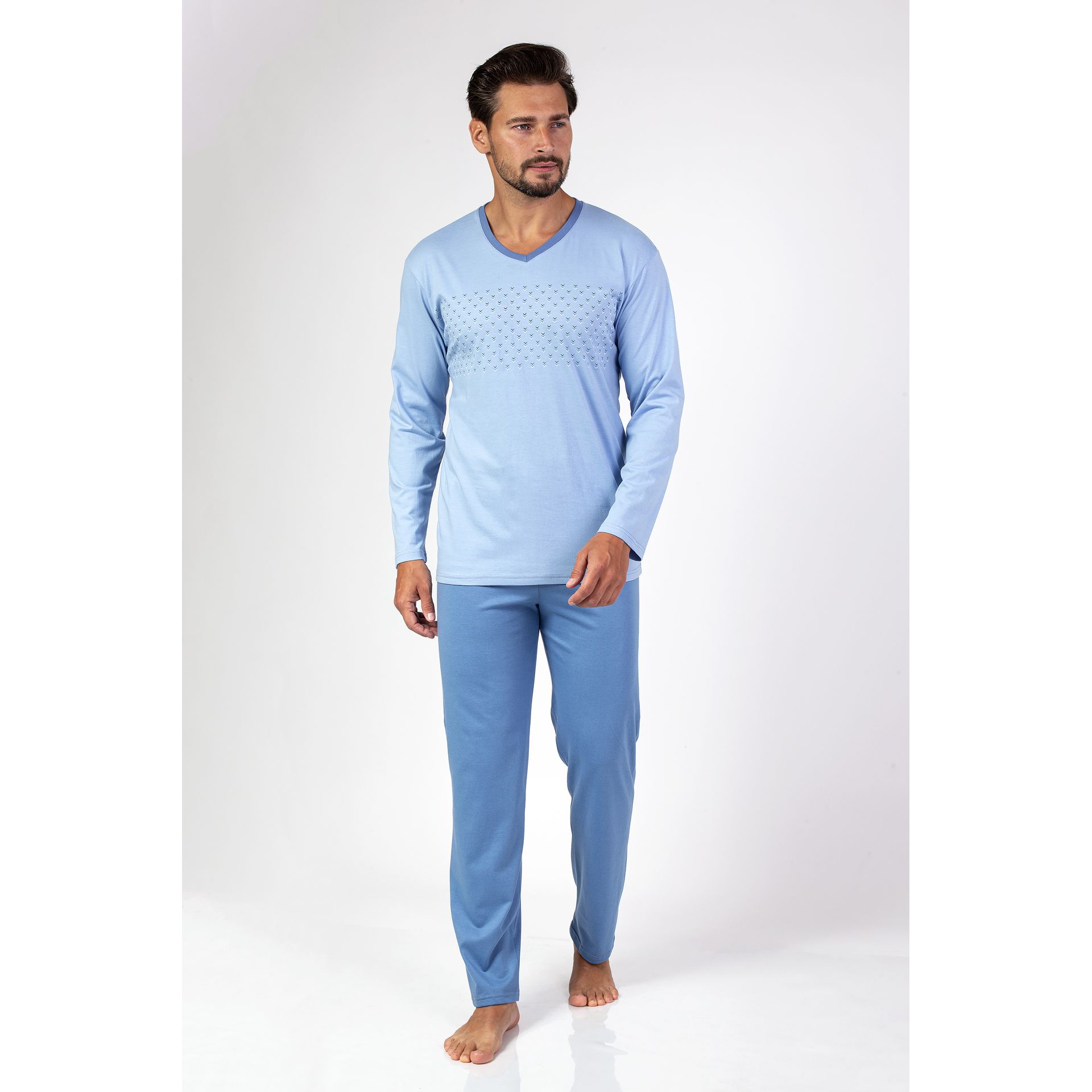 Regina 468 pánske pyžamo z 100 % bavlny – pohodlný voľný strih, potlač na prednej strane. Veľkosti: M, L, XL, XXL, 3 XL. Farby: nebeská, modrá, zelená.