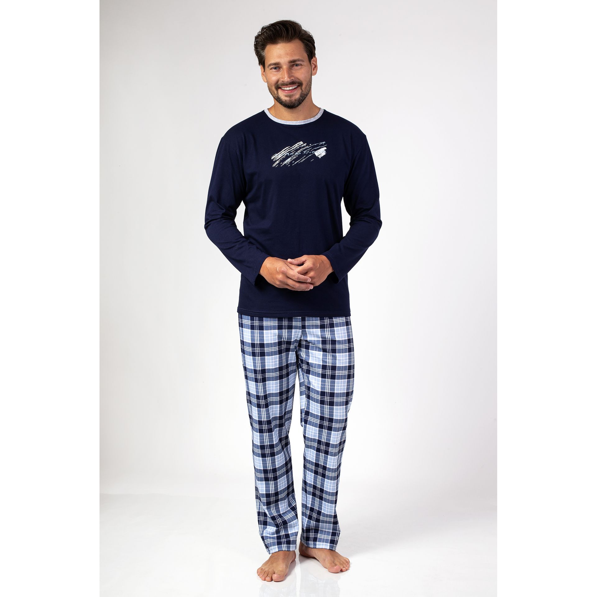Regina 469 pánske pyžamo z 100 % bavlny. Tričko s potlačou na hrudi a voľné kárované nohavice. Veľkosti: M až XXL, farby: melanž, granát, modrá.